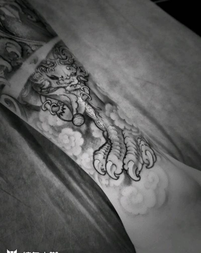 当前位置: 首页 >黑龙江省哈尔滨市纹身店-叁柒社纹身图案>唐狮子纹身图片_腿部传统动物原创成品纹身图案