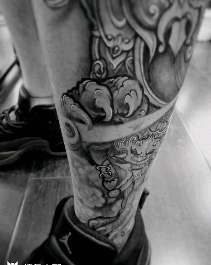 唐狮子纹身图片_腿部传统动物原创成品纹身图案