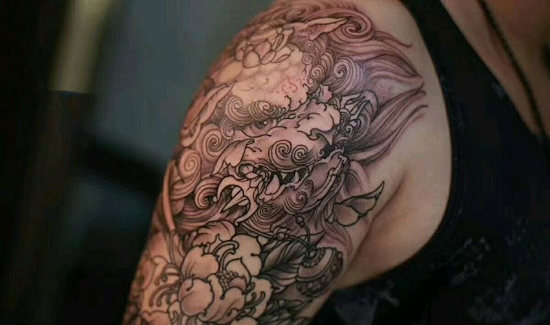 当前位置: 首页 >黑龙江省哈尔滨市纹身店-叁柒社纹身图案>唐狮子纹身图片_手臂传统动物原创彩色纹身图案