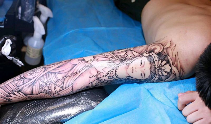 当前位置: 首页 >黑龙江省哈尔滨市纹身店-叁柒社纹身图案>孔雀明王花臂纹身图片_手臂传统动物人物宗教原创彩色黑灰纹身图案