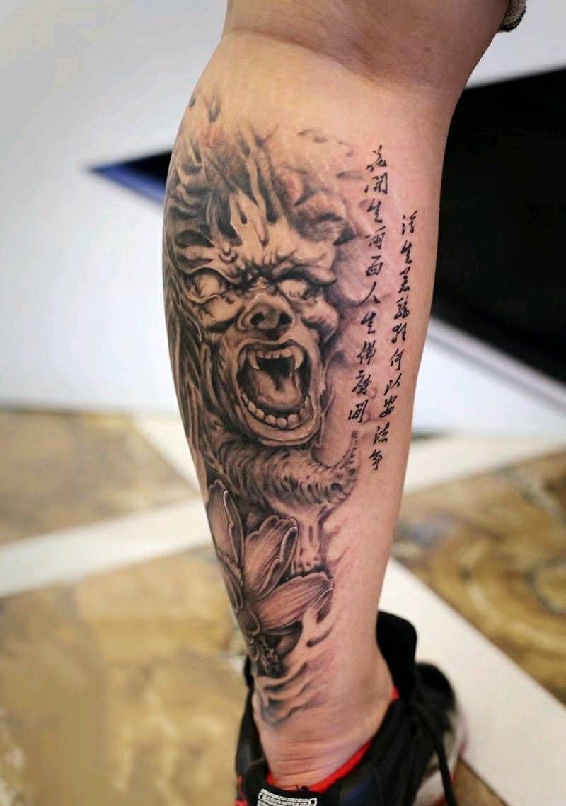 当前位置: 首页 >黑龙江省哈尔滨市纹身店-叁柒社纹身图案>佛魔禅纹身图片_腿部传统鬼神宗教原创彩色水墨字成品纹身图案