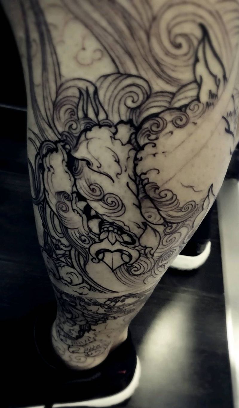 当前位置: 首页 >黑龙江省哈尔滨市纹身店-叁柒社纹身图案>未完小腿外侧唐狮子纹身图片