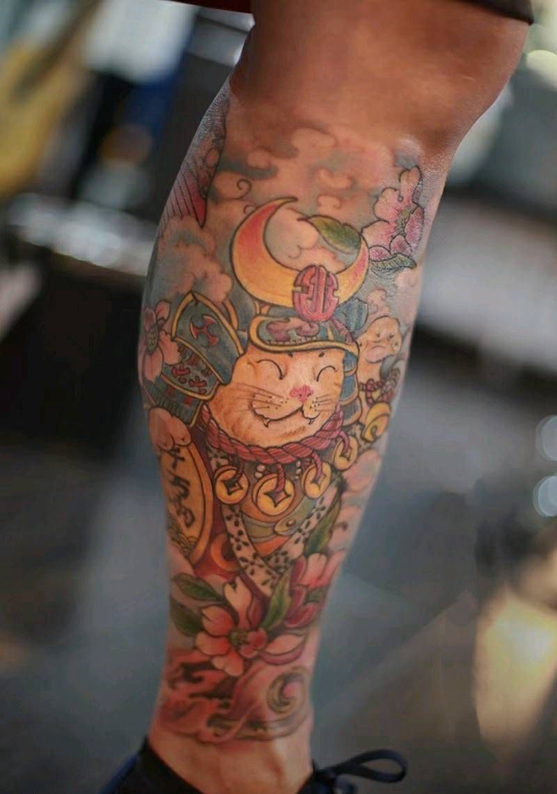 招财猫第二季纹身图片_腿部传统动物宗教原创彩色成品纹身图案