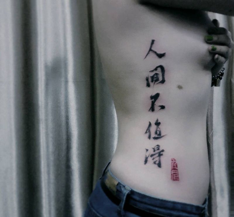人间不值得纹身图片_腰部传统国画字符原创水墨字成品纹身图案