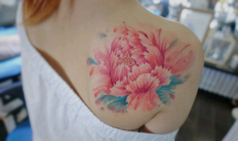 牡丹纹身图片_背部传统清新国画植物原创彩色纹身图案
