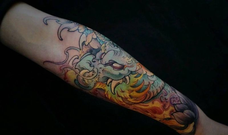 当前位置: 首页 >黑龙江省哈尔滨市纹身店-叁柒社纹身图案>龙臂纹身图片_手臂新传统彩色龙原创纹身图案