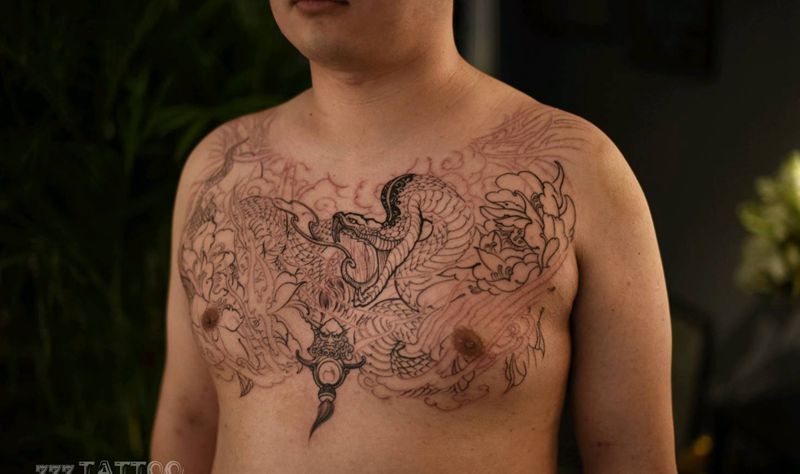 当前位置: 首页 >黑龙江省哈尔滨市纹身店-叁柒社纹身图案>花胸纹身图片_胸部新传统蛇牡丹原创纹身图案