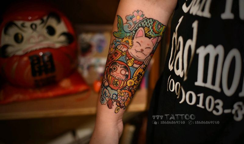当前位置: 首页 >黑龙江省哈尔滨市纹身店-叁柒社纹身图案>招财猫纹身图片_手臂新传统New School招财猫达摩招财纹身图案