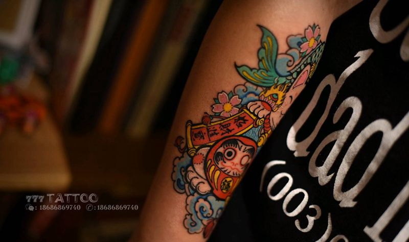 当前位置: 首页 >黑龙江省哈尔滨市纹身店-叁柒社纹身图案>招财猫纹身图片_手臂新传统New School招财猫达摩招财纹身图案