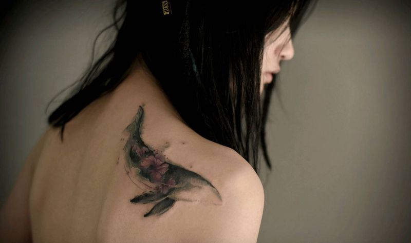 当前位置: 首页 >黑龙江省哈尔滨市纹身店-叁柒社纹身图案>鲸鱼纹身图片_肩部水彩水墨鲸鱼彩色纹身图案