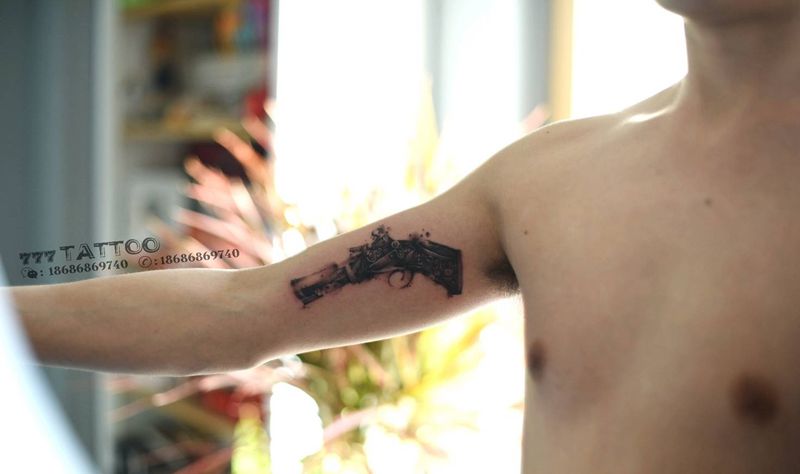水墨枪纹身图片_手臂水墨枪火铳原创纹身图案
