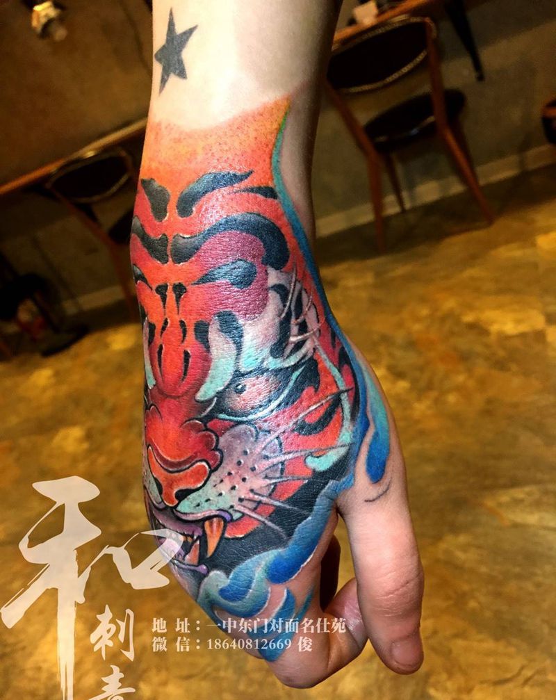 手背老虎彩色纹身图片_手部欧美传统动物纹身图案