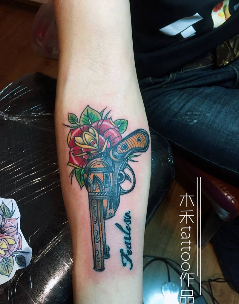 当前位置: 首页 >黑龙江省哈尔滨市纹身店-木禾 tattoo纹身纹身图案>手枪与花纹身图片