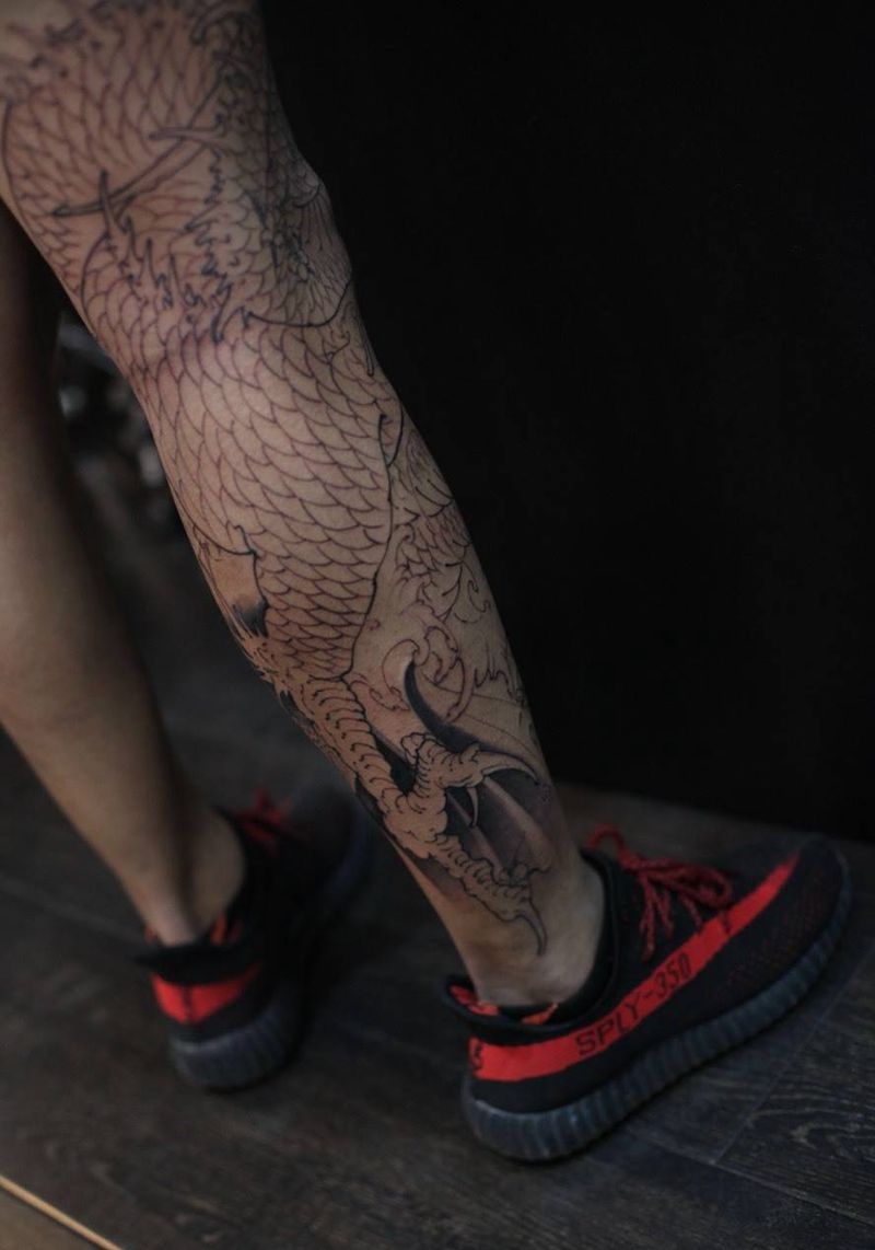 • T网红王老大花腿龙纹身图片_腿部新传统纹身图案