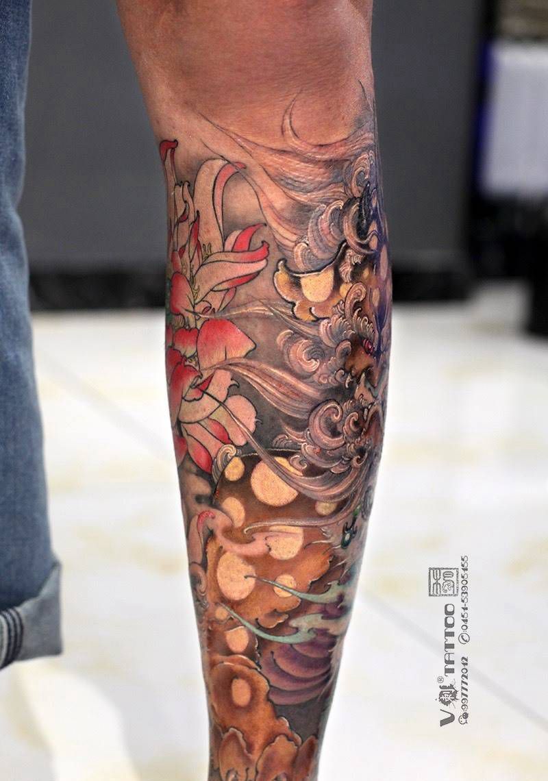 • T网红王老大花腿龙纹身图片_腿部新传统纹身图案