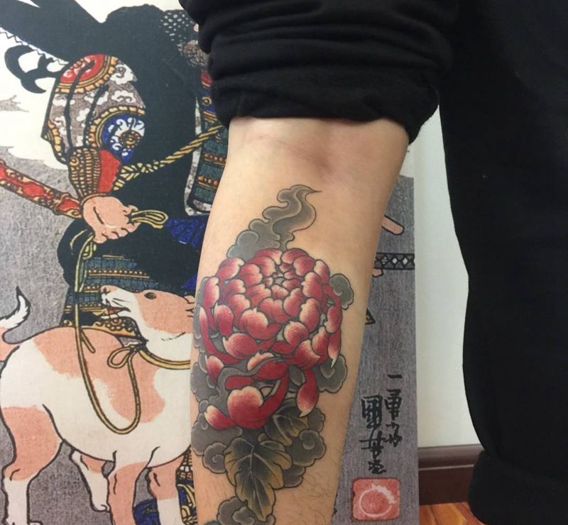菊花纹身图片_成品脚部腿部传统植物原创纹身图案