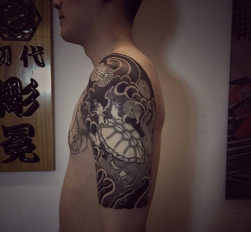 当前位置: 首页 >黑龙江省哈尔滨市纹身店-彫冕刺青纹身图案>半甲纹身图片_肩部手臂老传统纹身图案