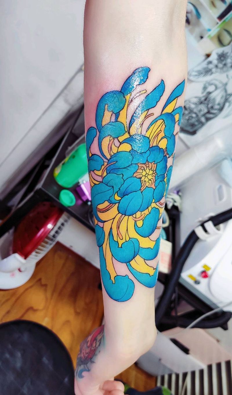 当前位置: 首页 >黑龙江省哈尔滨市纹身店-金艺堂纹身工作室纹身图案>彩色菊花纹身图片_手臂纹身图案