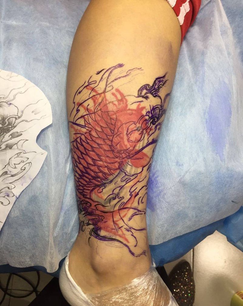 • T网红王老大花腿龙纹身图片_腿部新传统纹身图案