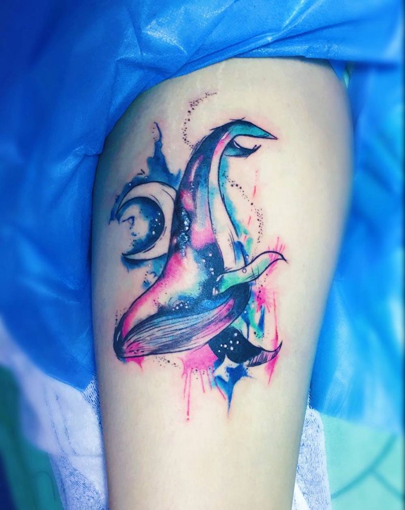当前位置: 首页 >黑龙江省哈尔滨市纹身店-金艺堂纹身工作室纹身图案>覆盖疤痕 水彩鲸鱼纹身图片