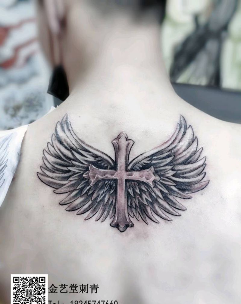 当前位置: 首页 >黑龙江省哈尔滨市纹身店-金艺堂纹身工作室纹身图案>十字架翅膀纹身图片_背部纹身图案