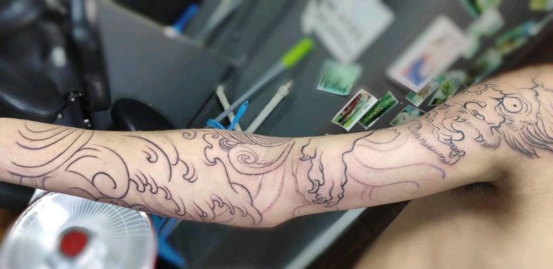 当前位置: 首页 >黑龙江省哈尔滨市纹身店-金艺堂纹身工作室纹身图案>传统花臂线条纹身图片_手臂纹身图案