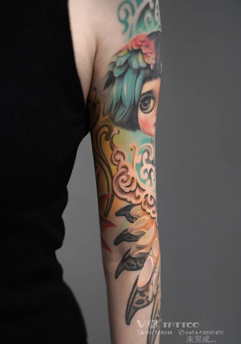 即将完成的重彩翅膀花臂…纹身图片_手臂欧美写实翅膀翅膀写实花臂纹身图案