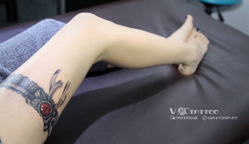 蕾丝美腿!纹身图片_腿部欧美写实原创哈尔滨V刺哈尔滨阿V3D蝴蝶结蕾丝纹身图案