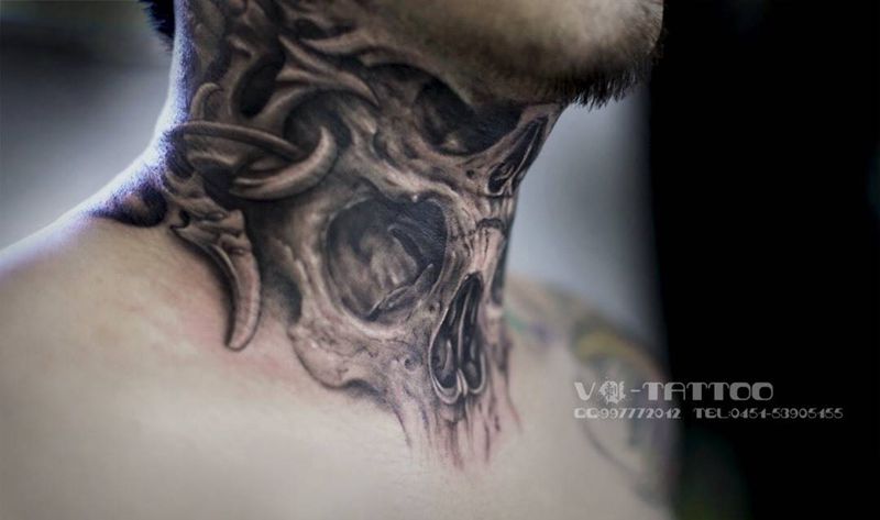 如此暴烈的存在纹身图片_成品欧美写实哈尔滨哈尔滨V刺骷髅脖子阿V纹身图案