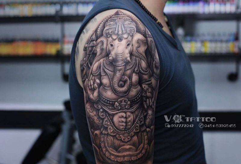 遥远异乡里,我们需要孤寂与信仰!纹身图片_成品手臂传统肖像写实宗教哈尔滨哈尔滨V刺阿V象神纹身图案