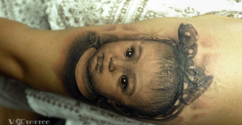 Lovely baby纹身图片_成品手臂写实肖像欧美原创人物哈尔滨哈尔滨V刺阿V纹身图案