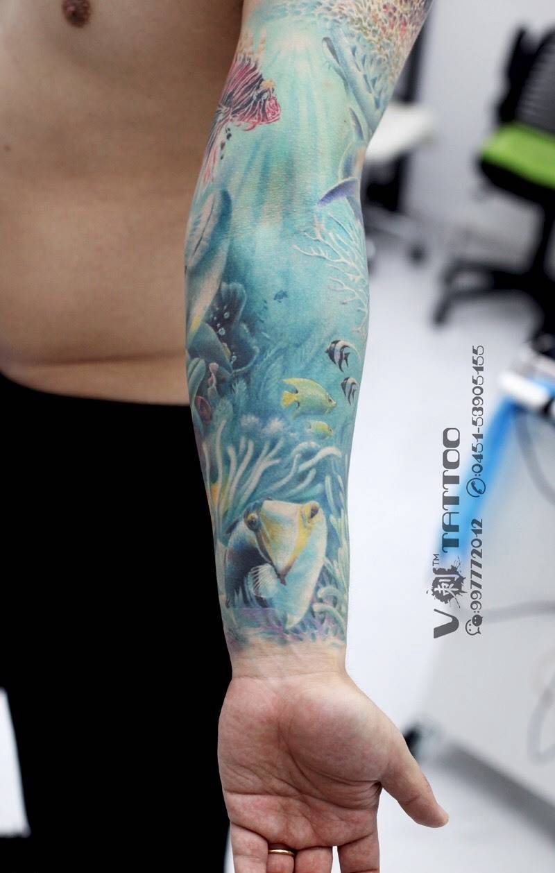 不需要人生规划,理想工作就是游荡纹身图片_手臂成品欧美写实原创哈尔滨哈尔滨V刺阿V花臂海洋花臂纹身图案