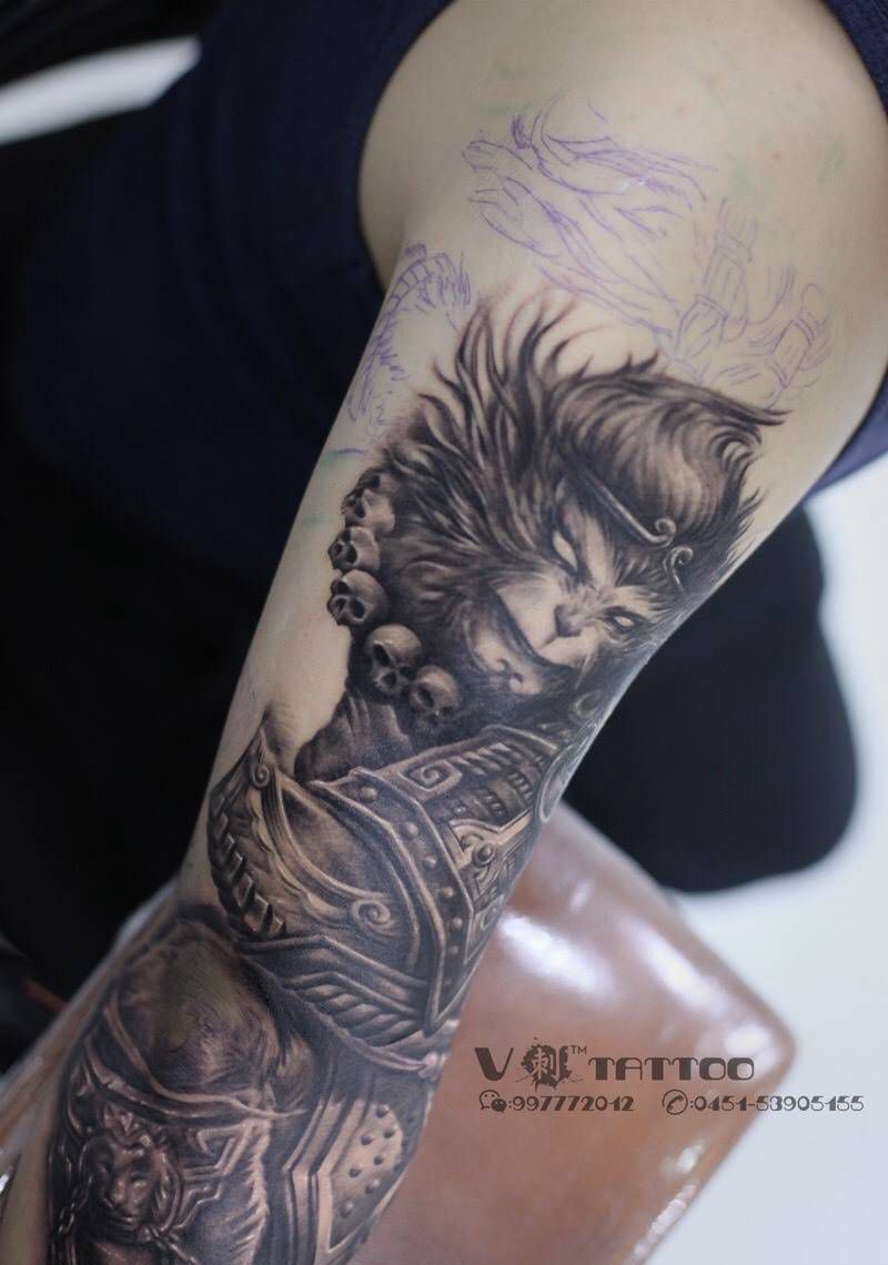 大圣归来!未完待续!纹身图片_成品手臂传统阿V作品花臂哈尔滨V刺肖像王子齐天大圣孙悟空纹身图案