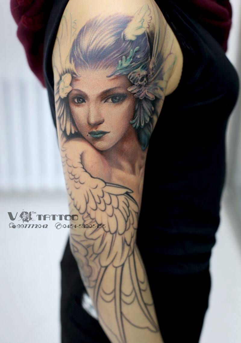 暗夜精灵未完成…纹身图片_成品手臂欧美肖像写实阿V作品花臂翅膀哈尔滨纹身图案