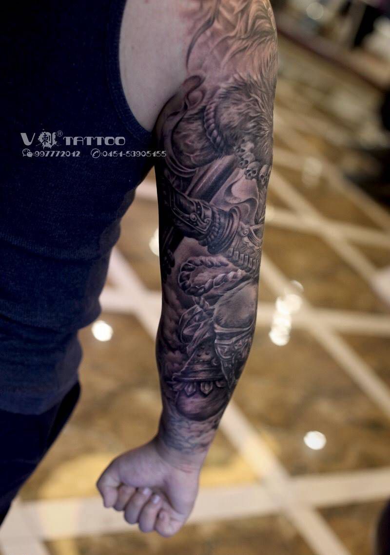 大圣归来完结篇!纹身图片_成品手臂传统阿V作品哈尔滨孙悟空齐天大圣花臂V刺肖像王子纹身图案