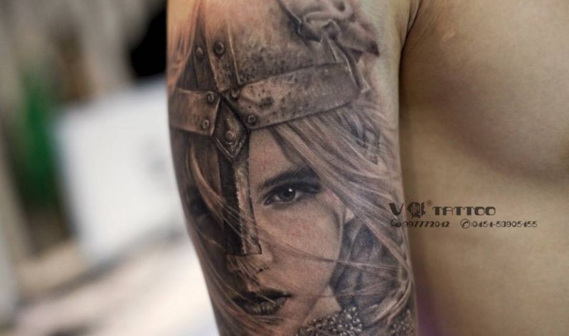 当前位置: 首页 >黑龙江省哈尔滨市纹身店-V刺tattoo纹身图案>女战士!纹身图片_手臂欧美写实肖像战神人物纹身图案