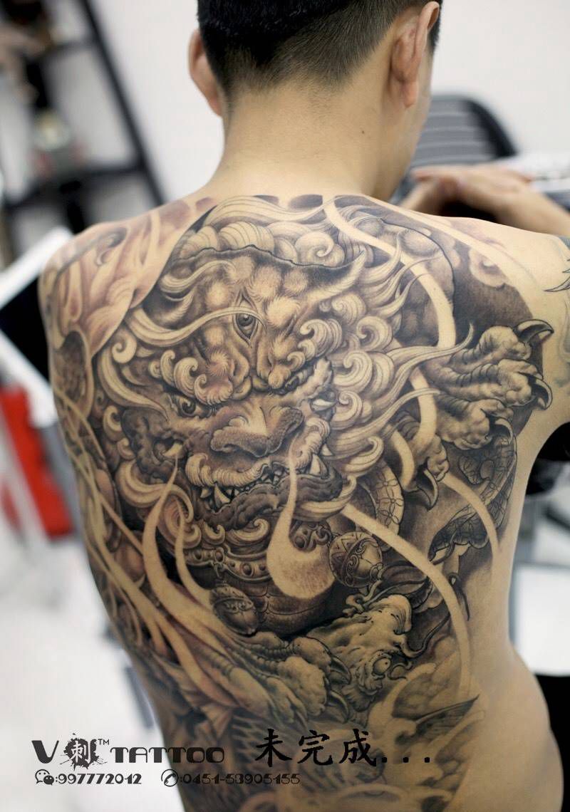 满背唐狮未完成…纹身图片_传统V刺 哈尔滨肖像王子阿V作品招财唐狮满背动物习俗纹身图案