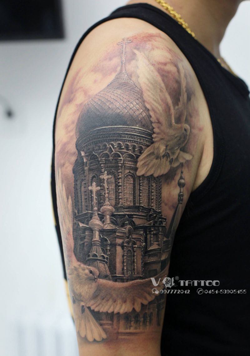 当前位置: 首页 >黑龙江省哈尔滨市纹身店-V刺tattoo纹身图案>圣索菲亚教堂纹身图片_手臂欧美写实建筑写实教堂纹身图案