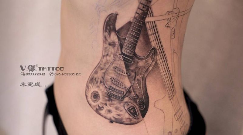 换一种组合方式!纹身图片_腹部欧美写实吉他乐器欧美纹身图案