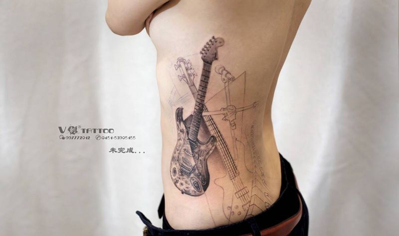 换一种组合方式!纹身图片_腹部欧美写实吉他乐器欧美纹身图案