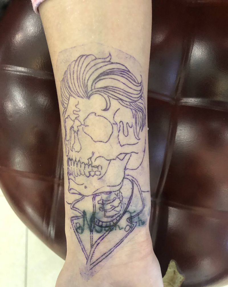 当前位置: 首页 >黑龙江省哈尔滨市纹身店-JD.tattoo纹身图案>骷髅先森纹身图片_手臂Old School遮盖纹身图案