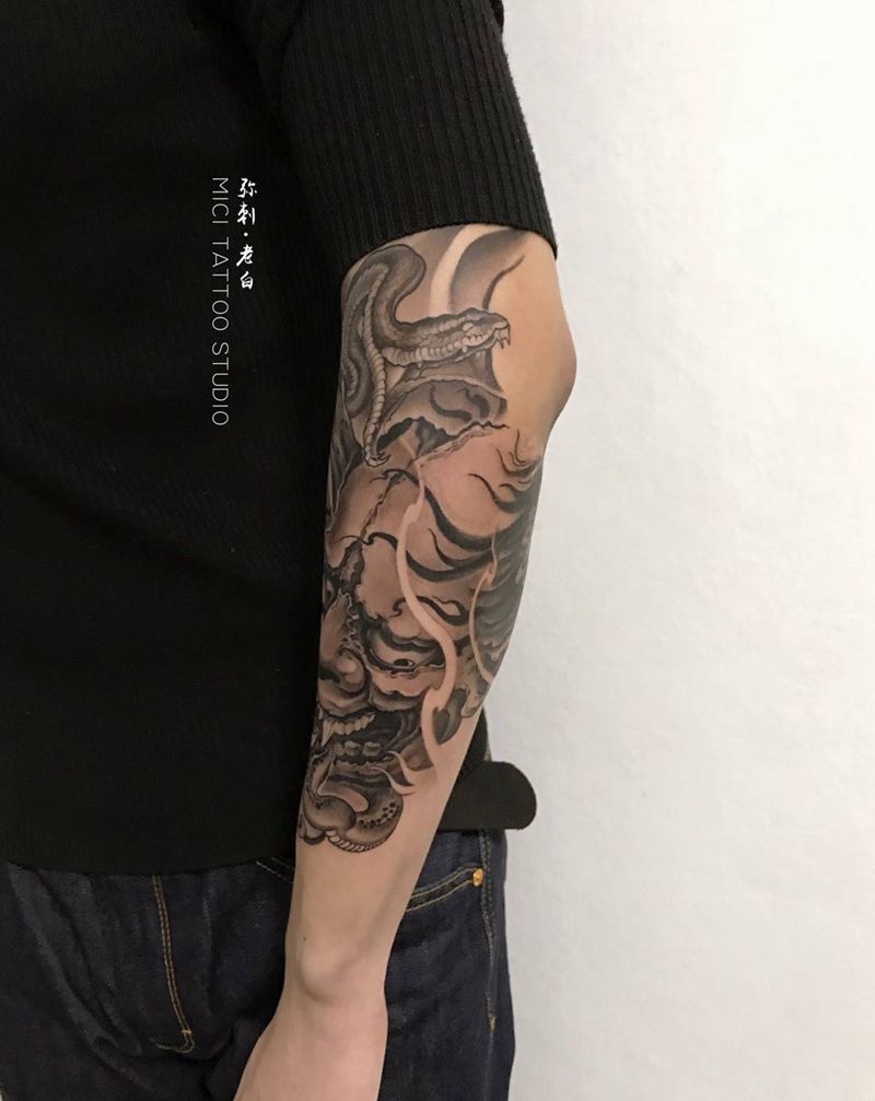 当前位置: 首页 >黑龙江省哈尔滨市纹身店-哈尔滨弥刺纹身工坊纹身图案>般若纹身图片_手臂新传统般若蛇纹身图案
