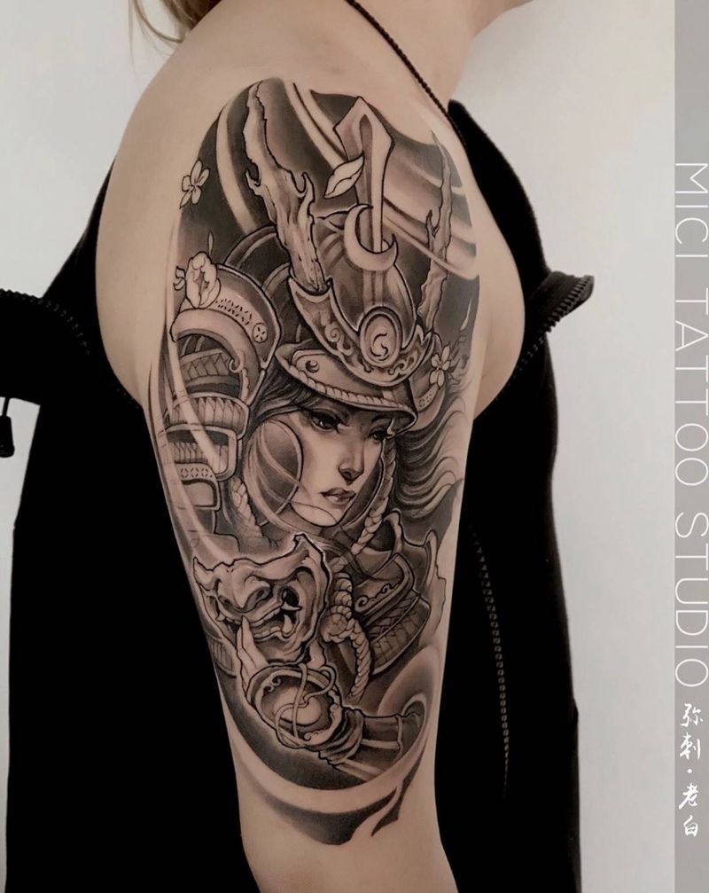 女武士纹身图片_肩部手臂新传统艺妓武者女武士纹身图案