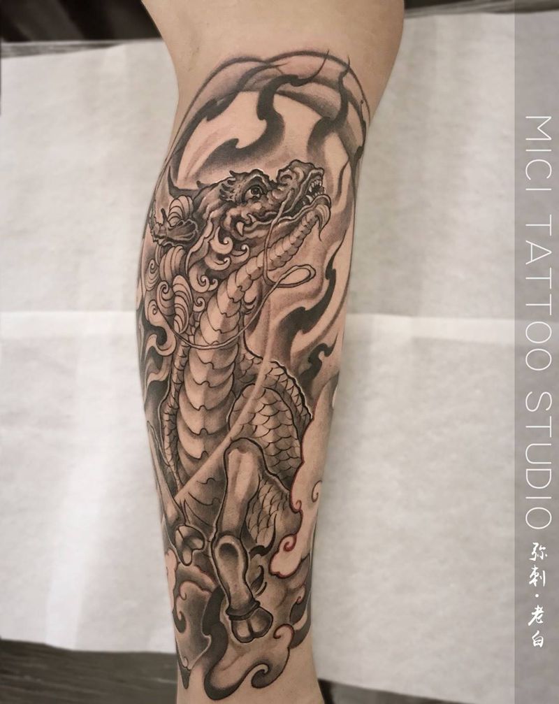 • T网红王老大花腿龙纹身图片_腿部新传统纹身图案