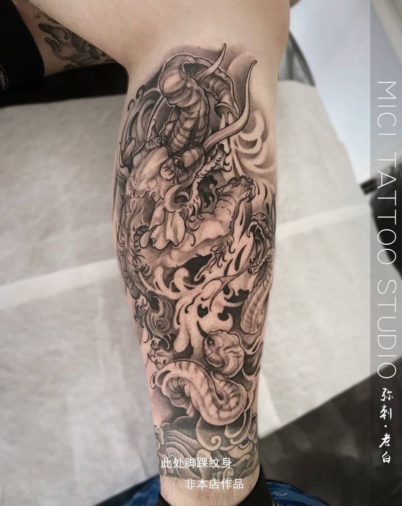 当前位置: 首页 >黑龙江省哈尔滨市纹身店-哈尔滨弥刺纹身工坊纹身图案>巴蛇吞象纹身图片_腿部传统象神蛇动物纹身图案
