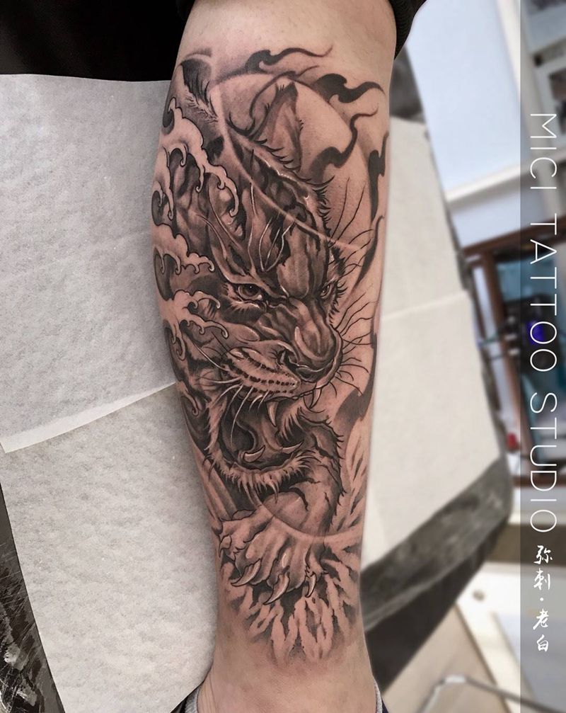 • T网红王老大花腿龙纹身图片_腿部新传统纹身图案