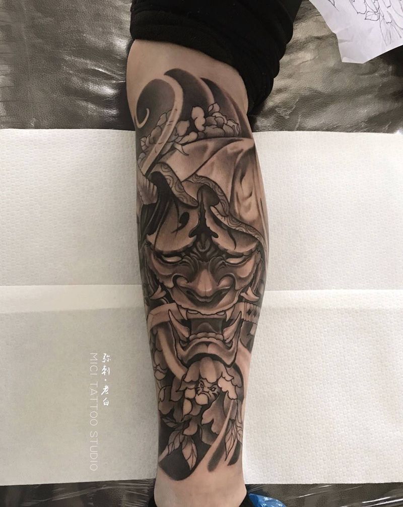 当前位置: 首页 >黑龙江省哈尔滨市纹身店-哈尔滨弥刺纹身工坊纹身图案>般若纹身图片_腿部新传统般若牡丹纹身图案