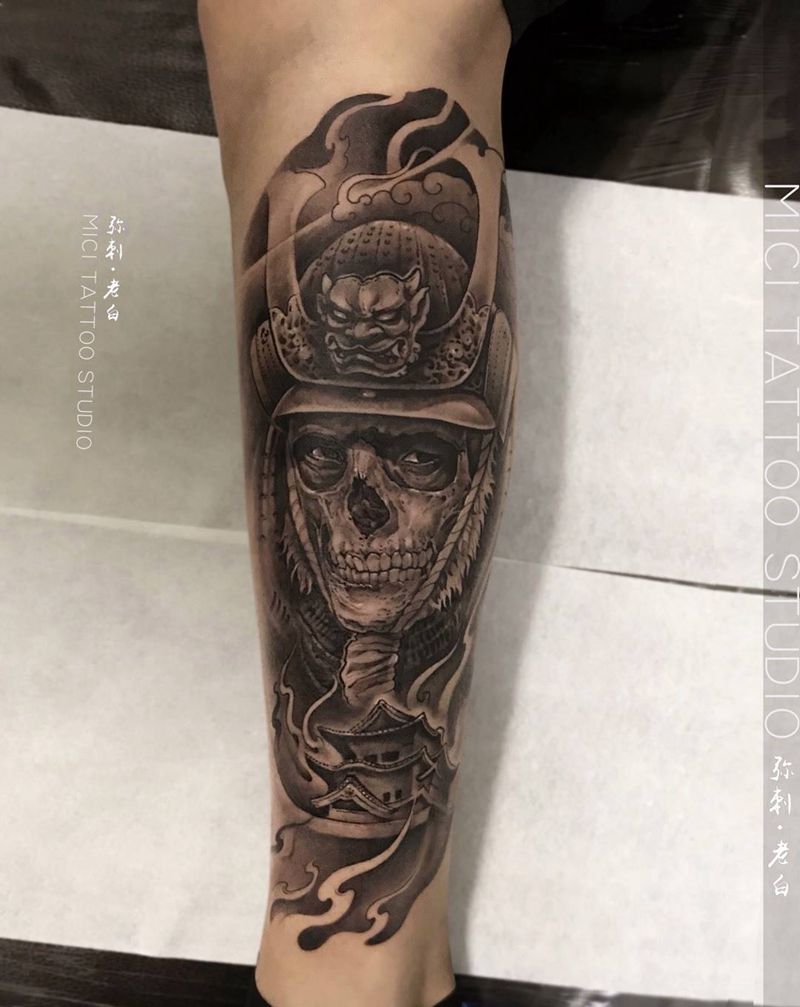 当前位置: 首页 >黑龙江省哈尔滨市纹身店-哈尔滨弥刺纹身工坊纹身图案>鬼武士纹身图片_腿部新传统欧美写实鬼武士武士纹身图案