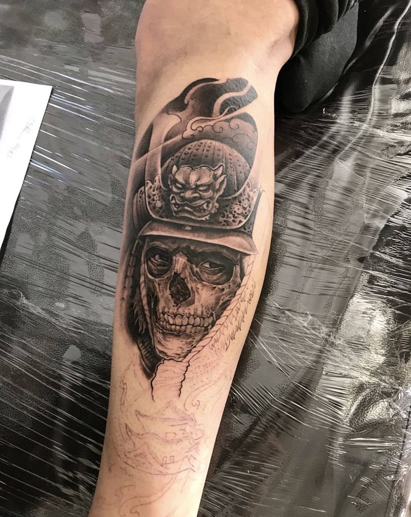 当前位置: 首页 >黑龙江省哈尔滨市纹身店-哈尔滨弥刺纹身工坊纹身图案>鬼武士纹身图片_腿部新传统欧美写实鬼武士武士纹身图案