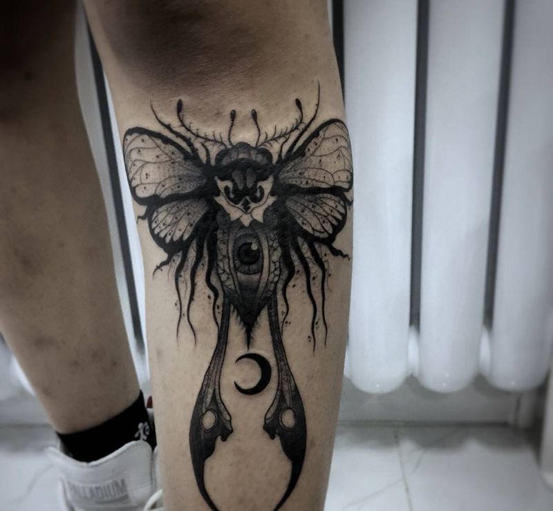 当前位置: 首页 >黑龙江省哈尔滨市纹身店-V刺tattoo纹身图案>蛾子纹身图片_成品手稿几何动物字符酷炫 线条腿部纹身图案